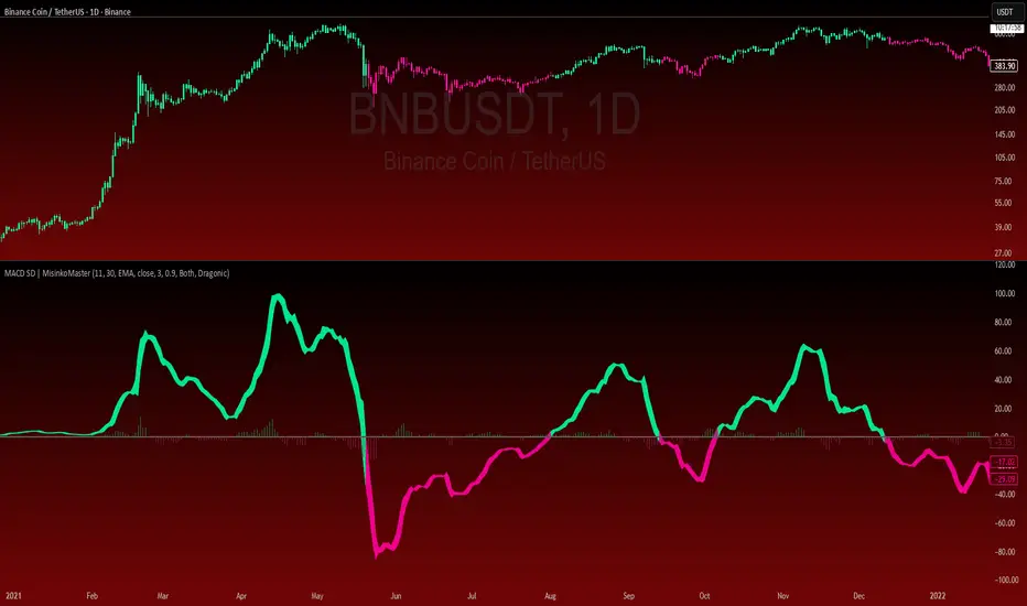 The objective is to create a cleaner MACD signal by measuring and adapting to its volatility. By accounting for dispersion, the indicator filters weak fluctuations and keeps meaningful momentum moves.