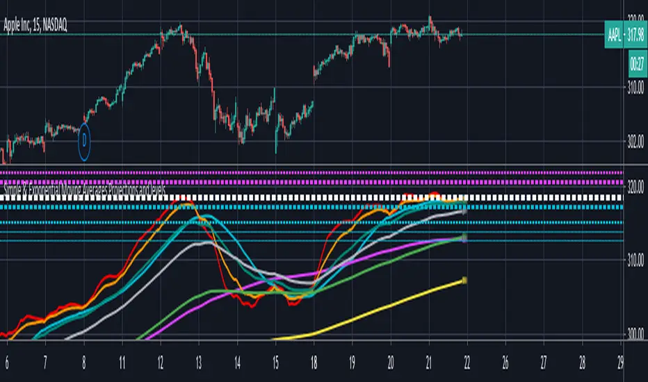 This can be used as an indicator separate from price to reduce clutter and simplify chart. Useful for EMA/MA strategies. Can be modified by user to change or omit inputs to their needs to further simplify. Showing projections, which use an internal filter for accuracy of closures, on multiple inputs is useful to determine higher probability market direction.