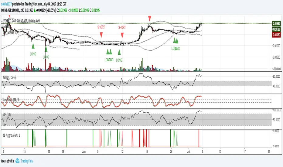 This is a script using 2 bollinger bands with different deviantions (for bull/bear markets) and slow stochastics / RSI to produce pikes. Now you setup your alerts to match green/red pikes.