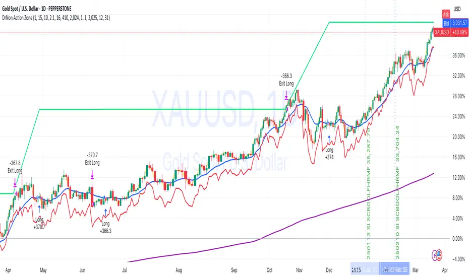 DrNon Action Zone is a long-only trend-following strategy that enters trades when momentum aligns with long-term trend confirmation. It uses: