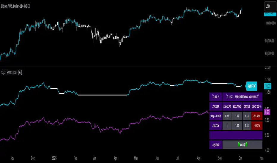 This indicator implements a simple yet effective exponential moving average (EMA) crossover strategy that compares a 12-period EMA against a 21-period EMA. The system generates long signals when the 12 EMA is positioned above the 21 EMA, and moves to cash when the 12 EMA falls below the 21 EMA.