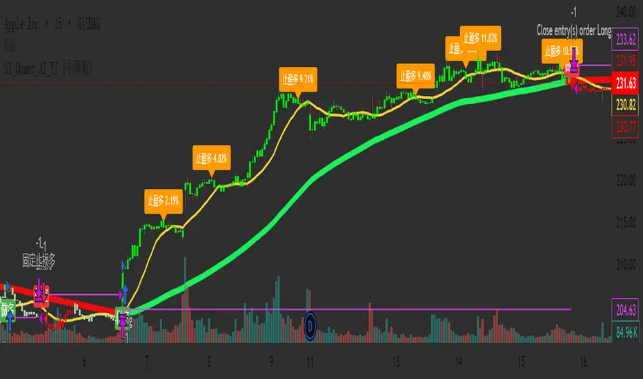 SY_Quant_AI_YJ is a trend-following visual strategy and alert system designed to help traders detect directional bias, time entries with MACD cross logic, and receive structured JSON-format push alerts. It combines Supertrend, EMA/SMA structures, and MACD cycles to build a coherent and actionable trend view, enhanced by visual stop-loss guidance and profit-taking alerts.