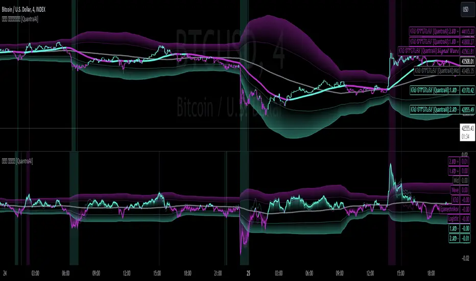 - The trend following functionality is indicated through the "𝓢𝓲𝓰𝓷𝓪𝓵 𝓦𝓪𝓿𝓮" Line, with optional "Up" and "Down" arrows to denote trend directions only (toggle “Show Trend Signals”).