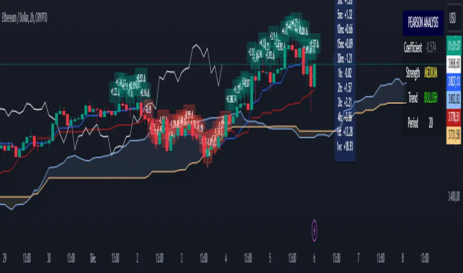 Ichimoku Cloud Plus is an advanced technical analysis tool that combines the traditional Ichimoku Cloud system with Pearson correlation analysis and multi-timeframe momentum tracking. This innovative approach provides traders with a comprehensive view of market trends, momentum, and potential reversal points across multiple time frames.