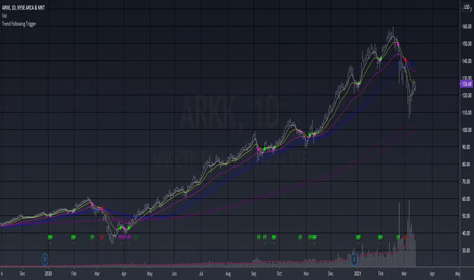 The 5,13 EMA pair is tracking the short-term momentum, when 5 EMA crosses over 13 EMA up or down, the script will develop a bullish "fast pivot" point or "FP", which can be used as the first entry of a position.