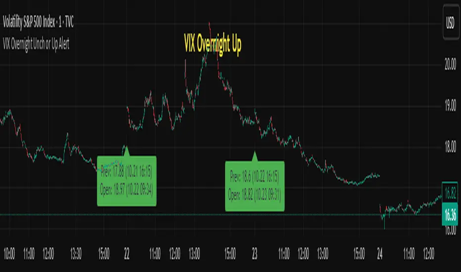 This indicator alerts when VIX opens the day unchanged or higher on the day. If in fact VIX opens up unchanged or higher, it will display near the first bar of the day, previous day's close time and level and the opening time and level. The close time is typically 16:15 New York Time and the opening time is 09:30 or the first print a few minutes later. I use TVC:VIX instead of CBOT because TVC for me is real time. I also use the 1 minute chart and the script is coded as 1 minute.