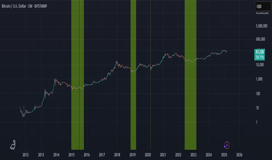 BTC DCA Range indicator is designed to help traders identify potential Dollar-Cost Averaging (DCA) opportunities for Bitcoin (BTC) based on deviations from a reference moving average (MA). It highlights price zones where BTC is trading significantly below a long-term moving average, suggesting potential undervaluation or buying opportunities.