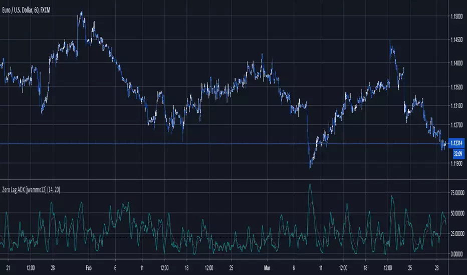This uses Zero lag principles to ADX. The cyan line is the zero lag line and the grey line is the traditional ADX