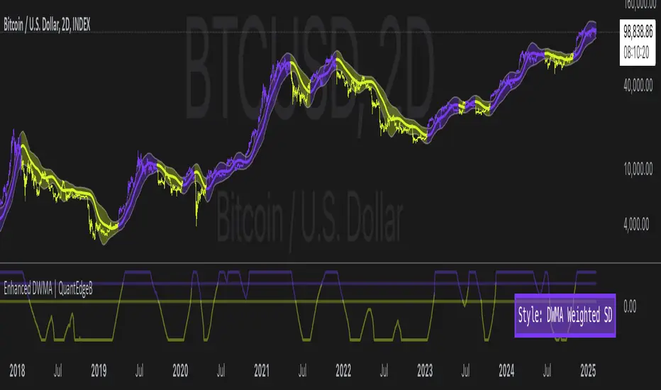 Enhanced DWMA | QuantEdgeB is an advanced Dual Weighted Moving Average (DWMA) system with three customizable filtering methods: ATR-based filtering, Standard Deviation (SD) bands, and a For-Loop-based trend scoring system. This indicator offers a versatile, adaptive approach to trend detection, allowing traders to fine-tune settings for breakout trading, trend confirmation, or volatility-based trend filtering.