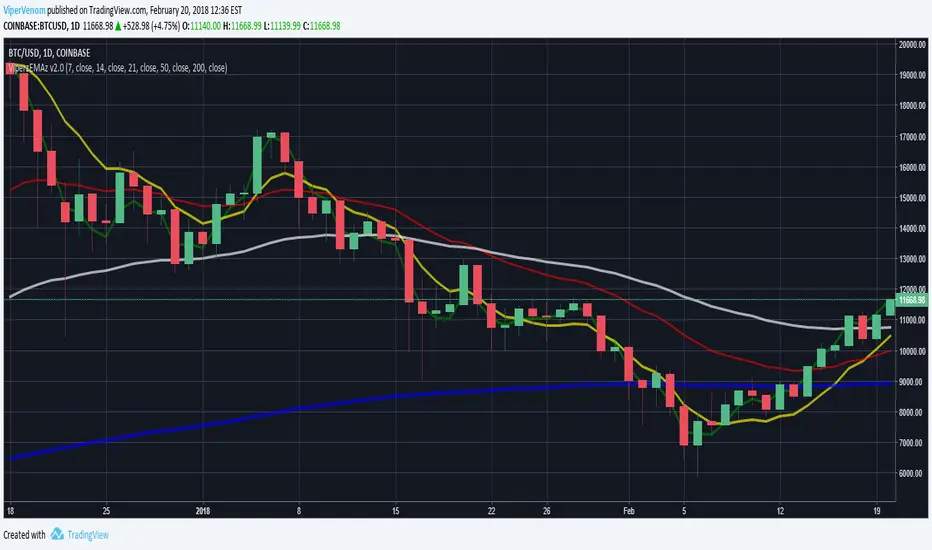 I have created a multi-layered Exponential Moving Average chart indicator, called Viperz Super EMA Mix. This is used to measure momentum of market trends. I had Bitcoin/Crypto trading in mind while creating it. Here is a breakdown of the different moving averages included, their default values and the reasoning behind why they were chosen.
