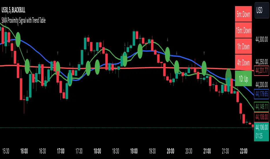 This Pine Script is designed to provide a variety of technical analysis signals based on Simple Moving Averages (SMAs) and market trends across different timeframes. The script combines multiple indicators, such as the SMA crossover, proximity conditions, and trend analysis, along with visual markers and support/resistance lines. Below is a detailed breakdown of the key features: