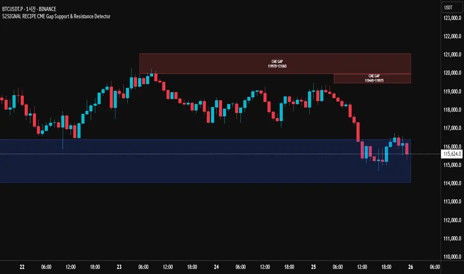 The 52SIGNAL RECIPE CME Gap Support & Resistance Detector is an advanced technical indicator that automatically detects and visualizes all types of price gaps occurring in the CME Bitcoin futures market on trading charts. It captures not only gaps formed during weekend and holiday closures, but also those created during the daily 1-hour maintenance period on weekdays, and sudden price gaps resulting from economic indicator releases or news events.