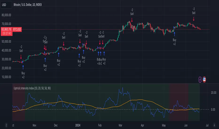 The "Uptrick: Intensity Index" indicator is a powerful tool for both short-term and long-term traders, offering clear buy and sell signals based on the crossover of the TII and its SMA, as well as the position of the SMA relative to the zero line.