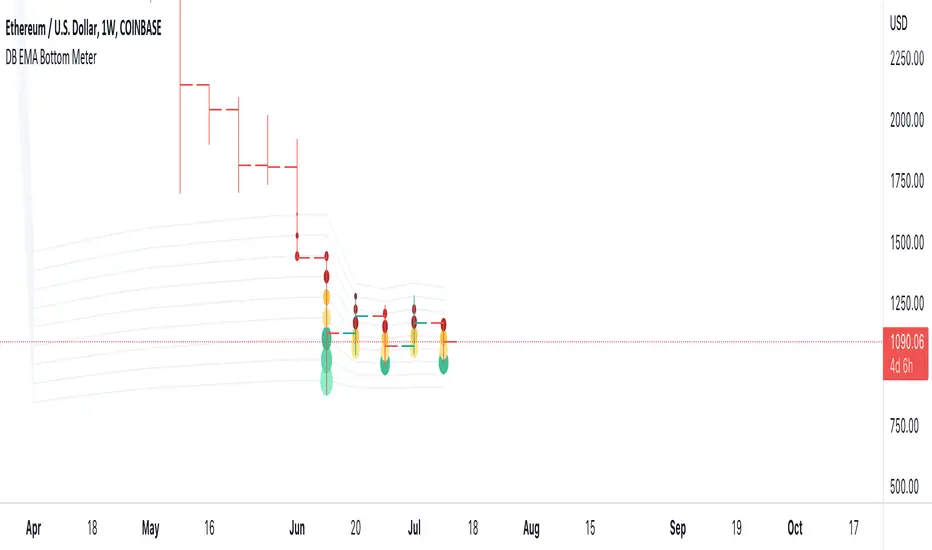 The DB EMA Bottom Meter indicator is explicitly designed for crypto on the weekly timeframe. The indicator predicts the weekly timeframe levels in real-time for buying/selling alerts easily displayed in visual color plots (dots). The bottom meter indicator is designed to be used in bear markets or when the price action drops below the 15 ema. It will display visual dots indicating the currently predicted levels, including 3 red dots for selling, 2 yellow dots for mid-range, and 3 green dots for buying.