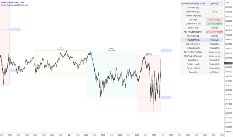 The NQ New York Probability Map Lite is a visual tool for NASDAQ 100 futures traders (NQ, MNQ) focusing on market structure, liquidity sweeps, and Asian/London session ranges, all filtered through an America/New_York (NY) timezone context.