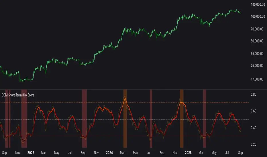 The Short-Term Risk Score is a composite indicator built to assess the short- to medium-term risk environment in the Bitcoin market. It synthesises 9 normalised components into a single dynamic score: Sharpe Ratio, Stablecoin Supply Ratio (SSR), MVRV Monthly Delta, Microstructural Price Risk, SOPR-Z, Short-Term Holder MVRV, Velocity RSI, Mayer Multiple, and the 30/60 Ratio Vector. These elements are drawn from both on-chain and market-derived data, offering a multi-angle lens into sentiment, valuation, spending behaviour, volatility structure, and capital rotation.