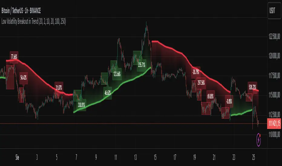 "Low Volatility Breakout in Trend" is a technical analysis tool that identifies periods of low-volatility consolidation within an ongoing trend and signals potential breakouts aligned with the trend's direction. The indicator detects trends using a simple moving average (SMA) of price, identifies consolidation zones based on the size of candle bodies, and displays the percentage change in volume (volume delta) at the breakout moment.