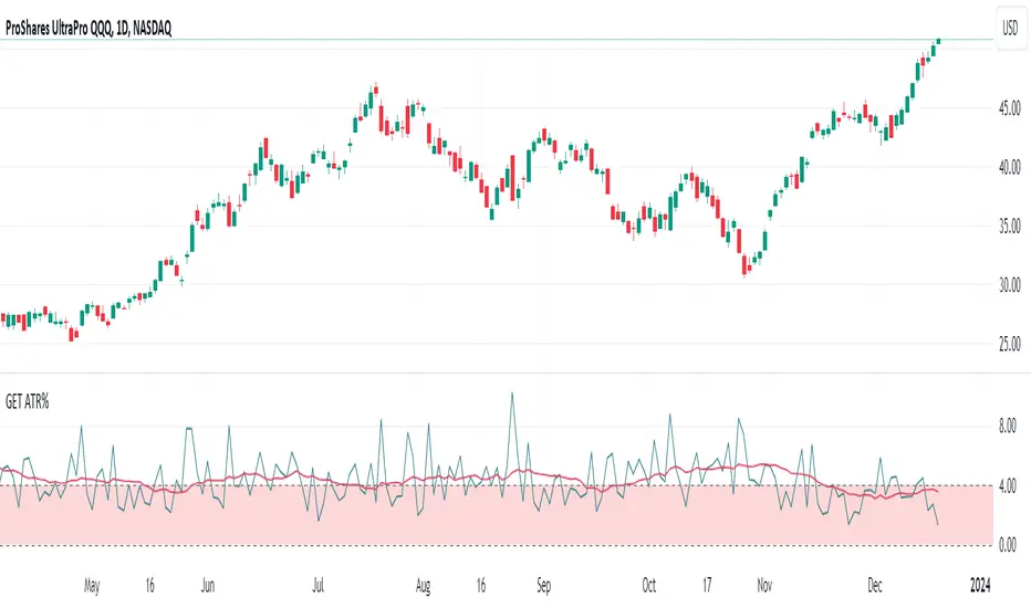 This indicator plots the Average True Range-ATR as a % of price and a SMA line. We like to day trade when the ATR is above 4% so the shaded area shows when the ATR is below the 4% level.