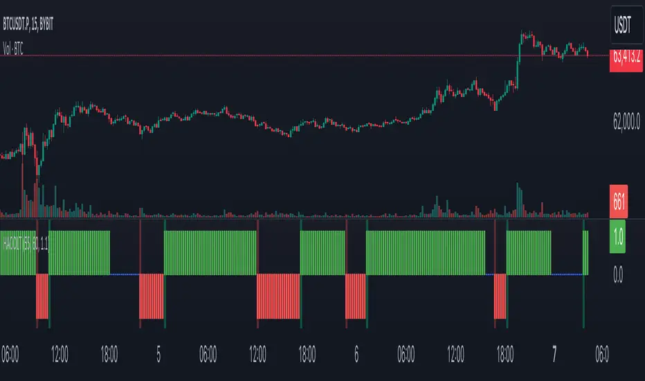 This indicator uses a modified Heikin-Ashi candle system with a TEMA (Triple Exponential Moving Average) to smooth out price data. It generates buy and sell signals based on the relationship between Heikin-Ashi candles and the TEMA. A "1" (green) indicates a buy signal when the trend is upward, and a "-1" (red) indicates a sell signal when the trend is downward. The indicator also includes a heartbeat feature to enhance clarity and confirm signals, making it easier to spot potential market movements.