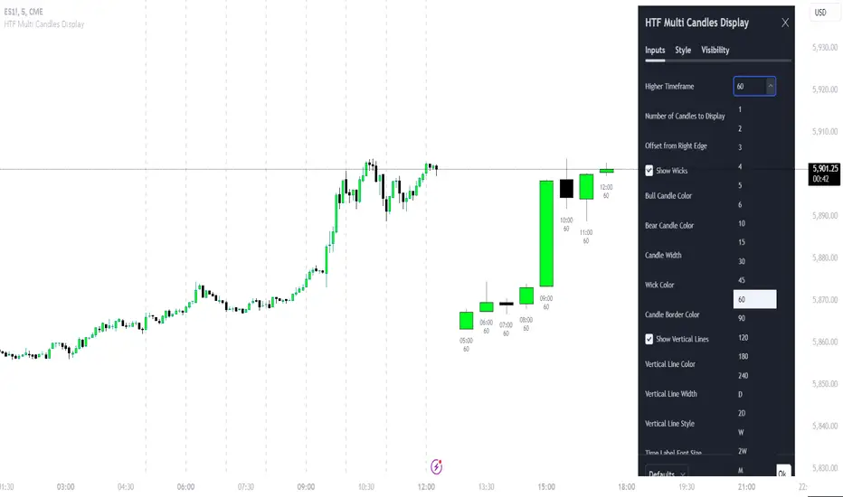 By displaying multiple HTF candles, traders can quickly assess the overall trend direction on higher timeframes, helping to align trades with the broader market direction: