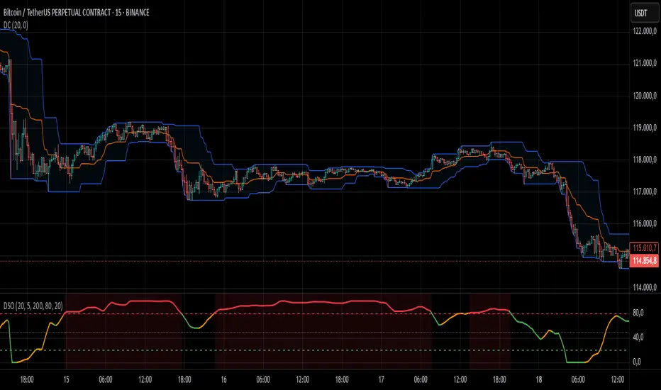 The DSO calculates the width of Donchian Channels as a percentage of the middle line, smooths this data, and then normalizes it using historical highs and lows over a specified lookback period. The result is inverted so that: