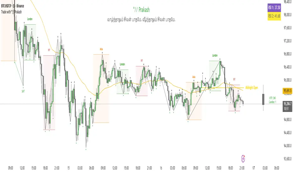 Trade with *// Prakash All-in-One ICT/SMC Toolkit: Dual ZigZag, Fractals, Killzones (Forex/ Indices), Midnight Open, HTF Candles, FVG Detector, SMT Divergence, RSI Table & Watermark.