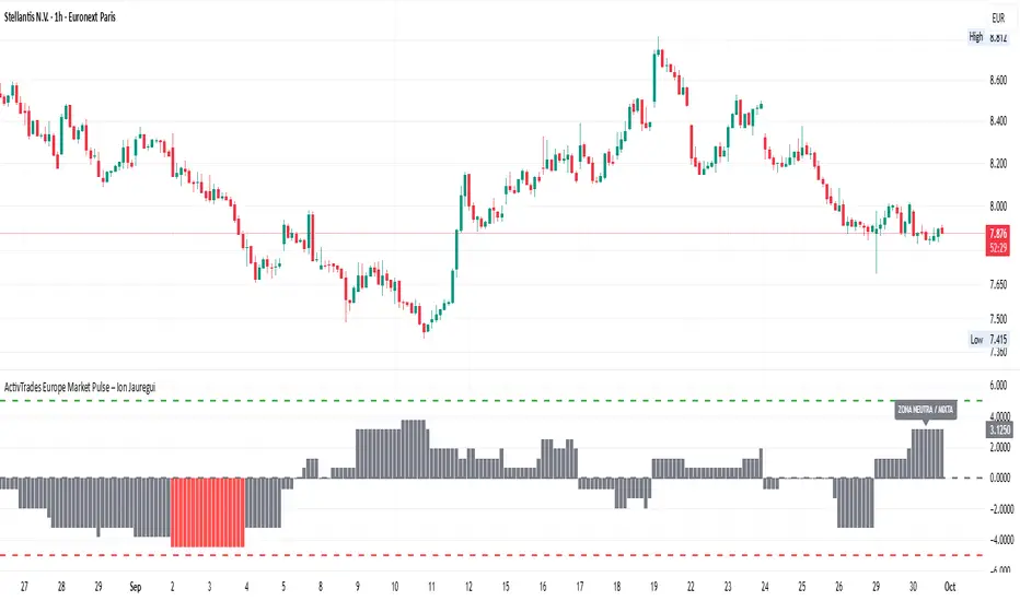 The ActivTrades Europe Market Pulse Indicator is a market analysis tool designed to assess overall risk sentiment in European financial markets. Unlike trading signals, it provides a clear view of market conditions, helping traders and analysts understand whether the market environment favors risk-taking or caution.