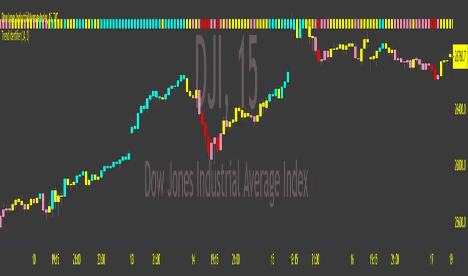 Trend Identifier is basically identifies the trend specially during range bound market / choppy market and false breakout . After long bull trend if pink candle/bar starts appearing there is possibility of trend reversal ( bear trend may start or price may consolidate in range until red candle doesn't appear ) vice versa !