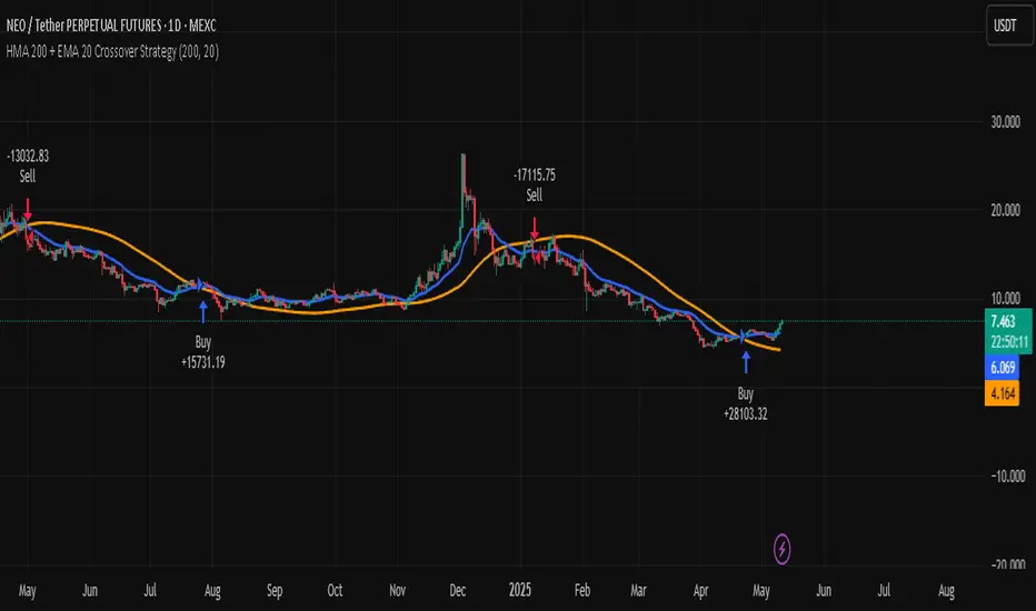 This strategy combines a long-term trend filter using the Hull Moving Average (HMA 200) with a short-term entry trigger using the Exponential Moving Average (EMA 20).