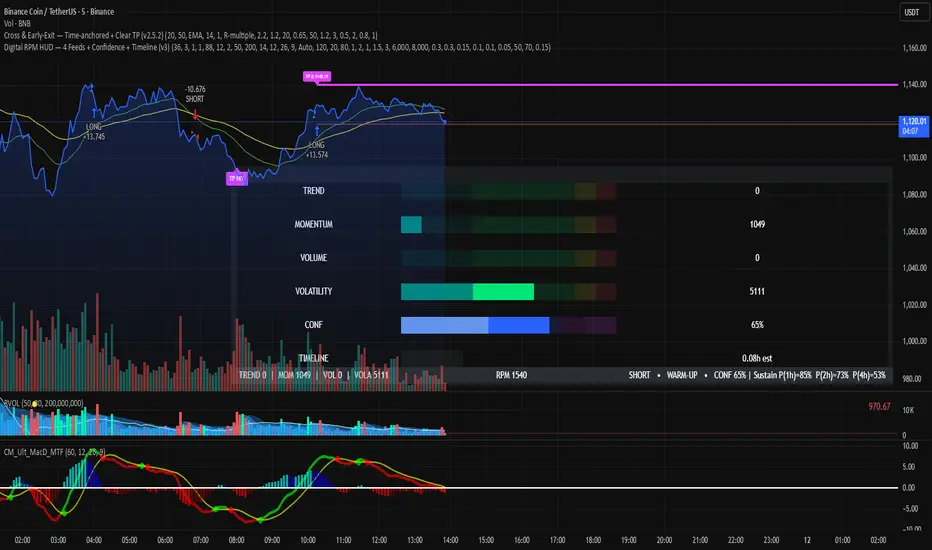 The Digital RPM HUD gives you an instant visual readout of market “engine speed” — combining four customizable data feeds (Trend, Momentum, Volume, Volatility) into a single confidence score (0–100) and a color-coded timeline of regime changes.