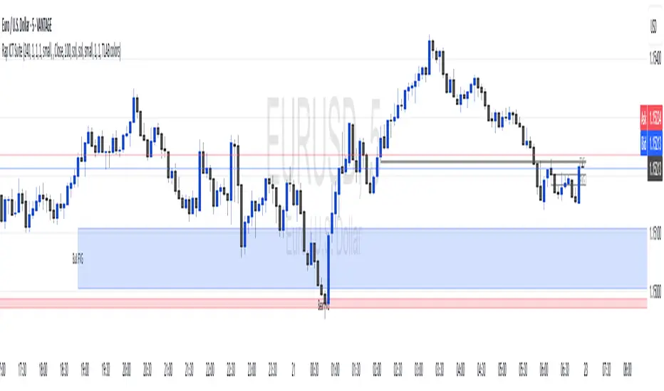 Current Timeframe FVG & iFVG (Lines/Labels): A second, independent engine tracks FVGs on your chosen timeframe, monitors them for mitigation, and automatically identifies when an FVG has been inverted (iFVG), a crucial shift in market dynamics.