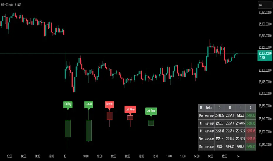 Continuously calculates and displays Open, High, Low, and Close values for each key timeframe (15m, 30m, 1H, 4H, and Daily) based on the ongoing session.