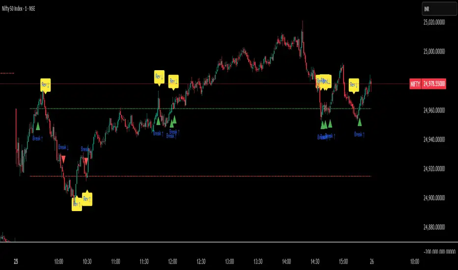 Highlights breakouts (price crossing above/below OR) and reversals (price returning back inside).