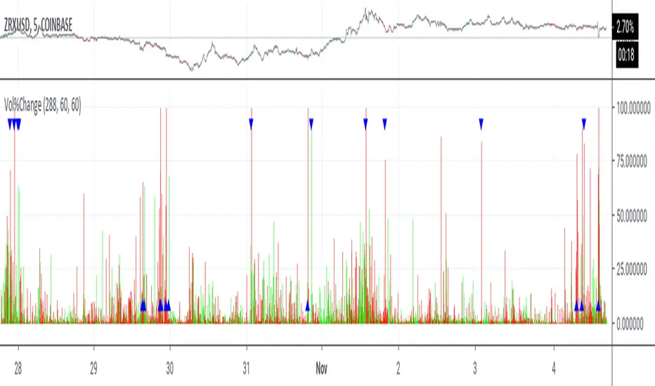 Like its companion study, Bar%Change, this is a visual study to hilight the change in volume by percentage. the percentages are calculated by the duration of the momentum. This study is not designed for automated trading.