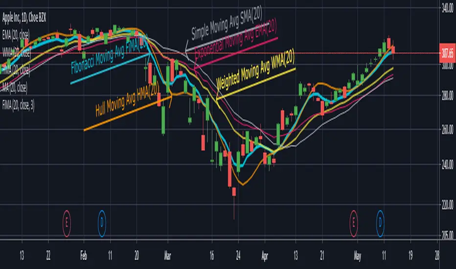 we will use the Fibonacci Sequence as weights to produce our moving average - so practically, we create a "Fibonacci Weighted Moving Average" (let's call it FiMA) - and compare the result with other commonly-used moving averages of the same length