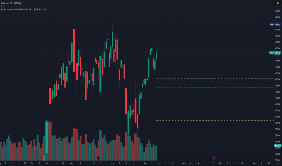 Use this alongside "Punjis Dynamic Daily EMA/SMA 5,9,21,50,100,200 Levels" (solid lines) and "Punji's Dynamic Monthly EMA/SMA 5,9,21,50" (dotted lines) for complete multi-timeframe analysis. The three indicators together provide comprehensive insight into daily, weekly, and monthly market structure without cluttering your chart. Daily = Solid lines, Weekly = Dashed lines, Monthly = Dotted lines.