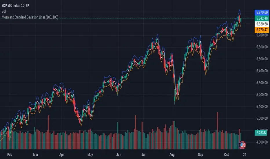 Plots the mean line, upper bound (mean + standard deviation), and lower bound (mean - standard deviation) to visualize price behavior relative to these levels.