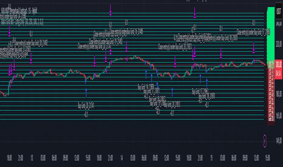 Each grid level acts as a buy zone — when price crosses below it, the bot opens a long position and takes profit when price reaches the configured Take-Profit (TP) target above that grid.
