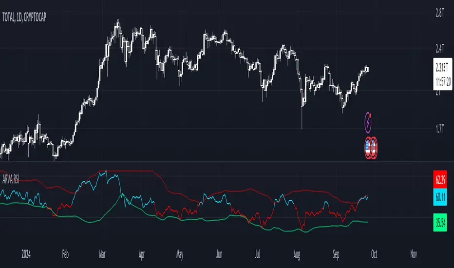 ARVA RSI is an advanced, adaptive version of the traditional RSI that dynamically adjusts to market conditions. Key features include:
