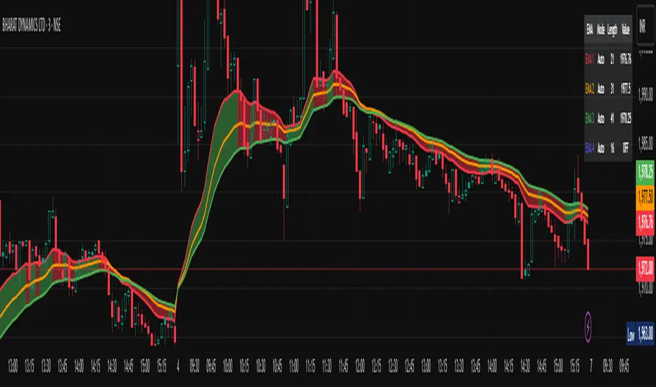 - **Dynamic Fill Colors**: Fill between EMA1 and EMA3 changes color based on price position