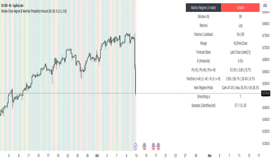 • Next-regime probabilities: Calm | Neutral | Volatile