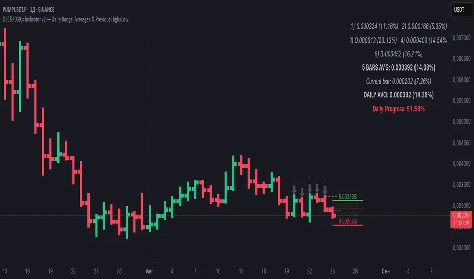 DEE's Indicator v2 โ Daily Range, Averages & Previous High/Low