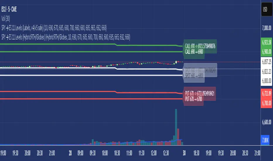 📌 SPY → ES 11-Level Converter (Hybrid RTH/Globex Ratio)This indicator converts key SPY options-based price levels into their equivalent ES futures levels and plots them directly on the ES chart. It is designed for intraday and overnight futures traders who rely on options-derived levels such as call walls, put walls, gamma levels, volume triggers, spot levels, and open-interest pivots.