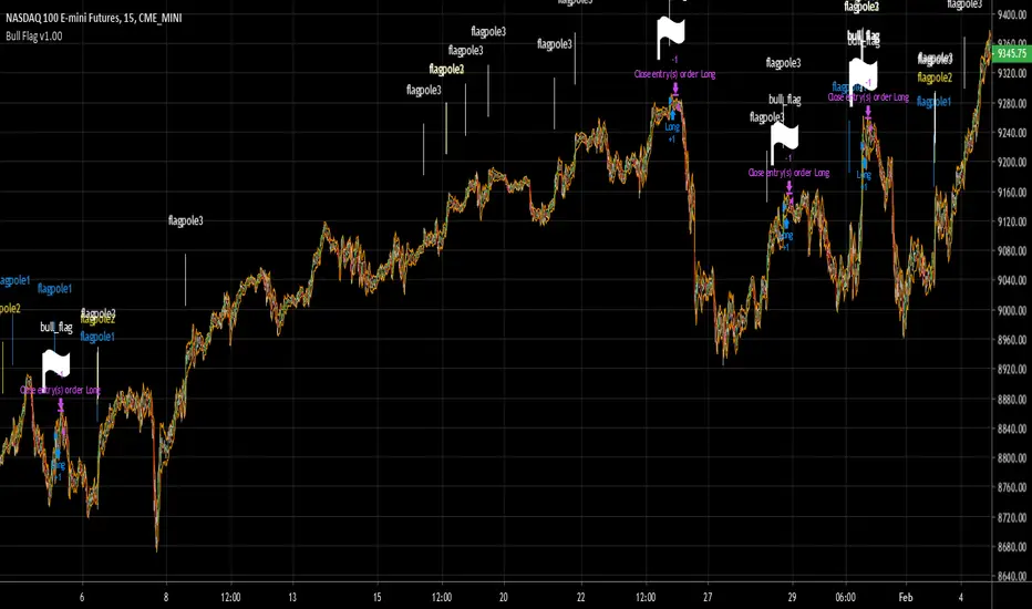 Identifies the chart pattern we recognize as a Bull Flag, enters long, then exits 6 bars later. I do not claim this to be a good strategy, but a lot of people think the Bull Flag is (statistically) meaningful. This is a tool for you to test that claim. The exit after 6 bars is somewhat arbitrary, but it's basically "hold this position for a little bit to see if bull flags actually do anything."