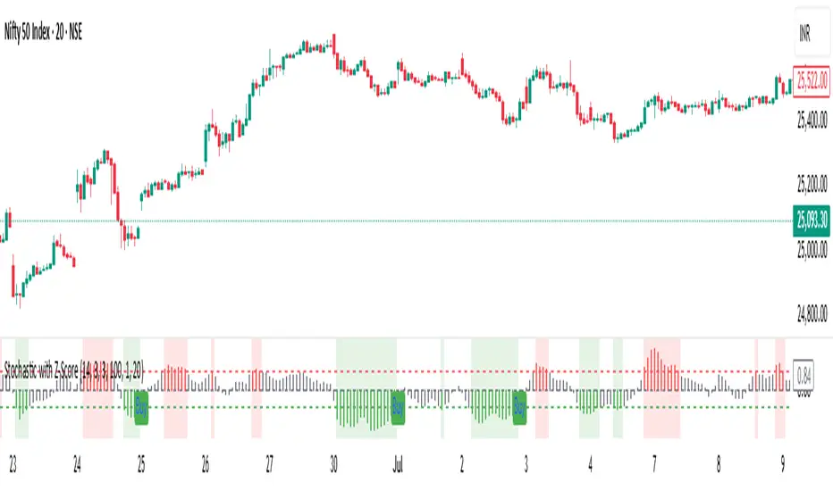 This custom indicator enhances the classic Stochastic Oscillator by applying Z-Score normalization to both %K and %D lines, helping traders identify statistically significant overbought and oversold conditions based on historical behavior.
