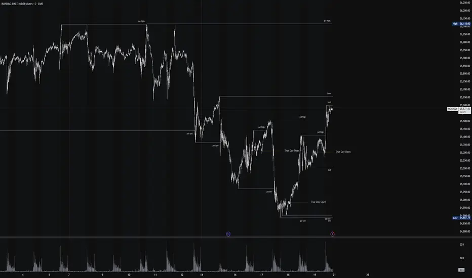 - Current High/Low of Day (HOD/LOD): Tracks the developing high and low of the current day.