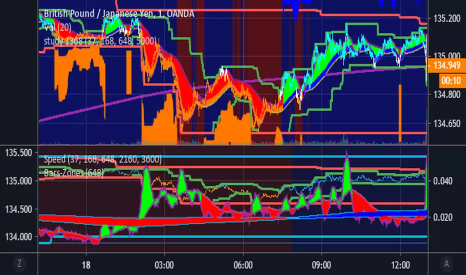 The background color blue and red for up and down trend dependent on lows and highs and bg average.