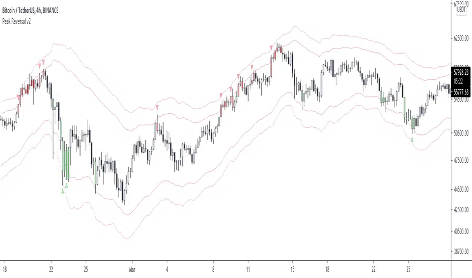 Peak Reversal can indicate whenever price crosses one of the bands. This can help traders identify points where a mean reversal play could be an option. Triangles indicate these crosses. New in version 2 is the ability to choose which of the bands to use to show these crosses. If you are more of an aggressive trader, you might find it better to show tight band crosses. If you are looking for more extreme market conditions, then choose extreme. The default is "normal".