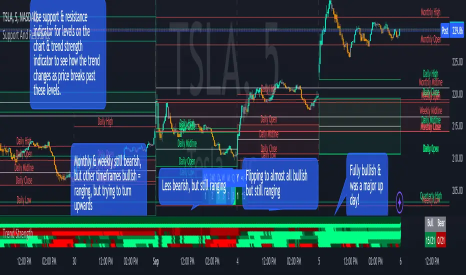 Added a new trend mode setting that offers trend scoring using Above/Below Midline or Open, High, Low, Close + Midline. Above/Below Midline is the new default setting as it makes the trend strength score graph easier to read and eliminates uncertainty from having multiple strength values like the other mode. This is the recommended mode for ease of use and identifying trends early. Open, High, Low, Close + Midline gives you a more detailed look at the overall trend strength, but due to having multiple strength values in each direction, can lead to uncertainty when making trading decisions.