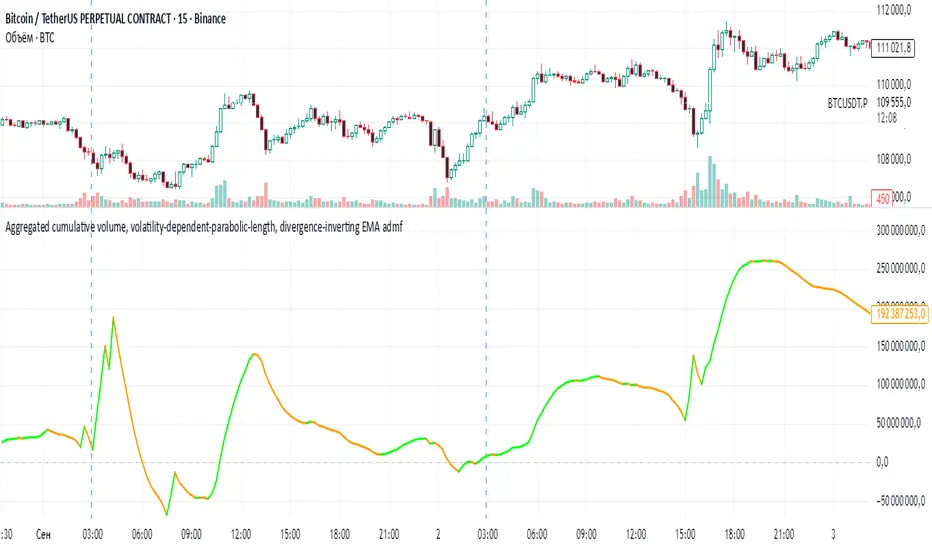 Script Name: ADMF: Rossgram Aggregated cumulative volume, volatility-dependent-parabolic-length, divergence-inverting EMA admf